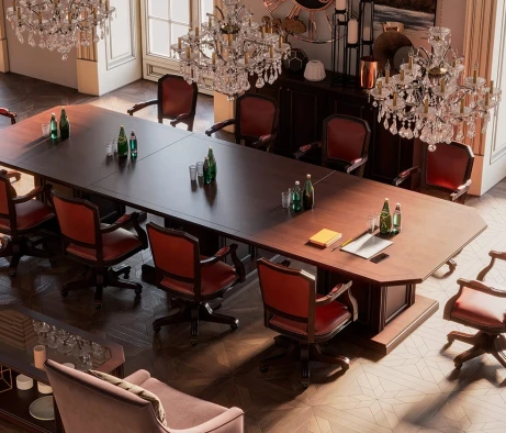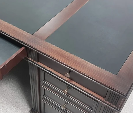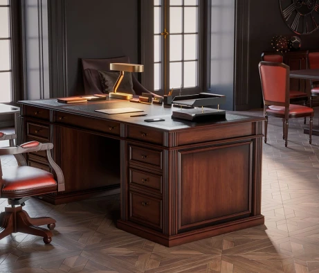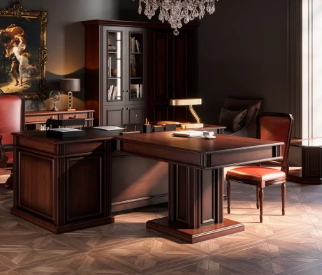В процессе обустройства кабинета руководителя компании застройщика у нас стояла задача создать офисное пространство, сочетающее в себе элегантность и функциональность. Для этого мы использовали мебель из серии DANTE в классическом стиле с темным ореховым оттенком. Этот выбор добавил кабинету утонченности и статусности.